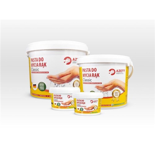 Pasta do mycia rąk AZETT CLASSIC/ AZETT. Profesjonalna, skoncentrowana pasta do mycia silnie zabrudzonych rąk, usuwa z powierzchni dłoni nawet bardzo silne zanieczyszczenia. Pasta wnika głęboko w skórę, docierając do jej porów dokładnie ją oczyszczając. Skoncentrowana pasta do mycia rąk z przyjaznym dla skóry naturalnym ścierniwem. Wspomagana przez delikatny środek ścierny, jakim jest mączka drzewna, jest delikatna dla skóry a jednocześnie wyjątkowo skuteczna. Skład pasty został uzupełniony o substancje pielęgnujące, które skutecznie chronią skórę dłoni przed mikrouszkodzeniami a także tworzą film ochronny, który wzmacnia skórę oraz blokuje wnikanie szkodliwych substancji. Pasta została przetestowana dermatologicznie, posiada pH zbliżone do pH skóry dłoni, gwarantuje bezpieczeństwo stosowania i doskonały efekt użycia. Dzięki zawartości kaolin w paście ręce po umyciu nie są tłuste, nie kleją się oraz pochlania nadmiar sebum. Pasta w swym składzie nie zawiera rozpuszczalników, silikonu i mydła, powodujących pękanie skóry. Idealna pasta, która gwarantuje skórze dłoni usunięcie nawet najtrwalszych zabrudzeń, przyjemny zapach a jednocześnie dając pełną ochronę skóry. Idealna pasta dla mechaników, serwisantów, majsterkowiczów.