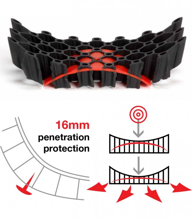 System REDBACKS to opatentowana struktura materiału z miękką wkładką elastyczną (Leaf-spring) osadzoną w osnowie na wzór plastra miodu do pochłaniania i rozłożenia sił nacisku.