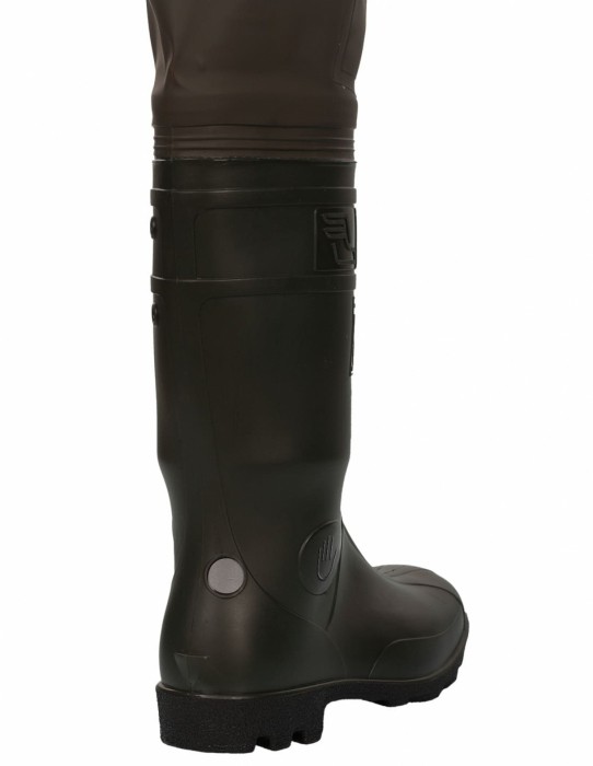 Wodery WRM02B MAX S5/ PROS spełniają normy EN 13688 (odzież ochronna, wymagania ogólne)/ EN 343 (odzież ochronna przed deszczem)/ EN 20345- S5 SRC (obuwie bezpieczne, ochrona palców stóp przed uderzeniem z energią 200J). Rewelacyjne, wytrzymałe wysokie buty rybackie z wgrzanymi na stałe kaloszami i wzmocnieniami na kolanach. Fason do bioder z elastycznymi mocowaniami podtrzymującymi. Wygodne mocowanie do paska spodni. Występuje w kolorze Zielonym, rozmiar od 39 do 48. Wykonane z PLAVITEX HEAVY DUTY (gramatura 700g/m2) materiał na podkładzie poliestrowym, jednostronnie powlekany PVC. Materiał cechuje się zwiększoną odpornością na tarcie, zginanie przy ujemnych temperaturach do -50ºC. Zapewnia pełną ochronę w niesprzyjających warunkach atmosferycznych. Technika obustronnego zgrzewania zwiększa wytrzymałość szwów. W pełni nieprzemakalne, do brodzenia w wodzie. Cechują się bardzo dobrymi właściwościami antypoślizgowymi. Solidna podeszwa z grubym protektorem gwarantuje stabilność nawet na miękkim i śliskim podłożu. Wodery dla bezpieczeństwa stóp przed urazami zostały wyposażone we wkładkę antyprzbiciową i podnosek, który chroni palce stóp przed uderzeniem z energią 200J. Wytrzymały materiał zapewnia długotrwałe i komfortowe użytkowanie a fason daje możliwość szybkiego zakładania i zdejmowania. Model sprawdzony w wędkarstwie, rybołówstwie, rolnictwie i leśnictwie. Wygodne i wodoodporne, swobodne w ruchu wodery są niezastąpione dla wędkarzy łowiących w rzekach, wykorzystywane przy połowach i ciężkiej pracy rybackiej. Dają największe możliwości na łowisku. Niezbędne wyposażenie każdego wędkarza chcącego skutecznie łowić na spinning lub muchę. Sprawdzą się również podczas mycia i czyszczenia w wodociągach, kanalizacji i usługach komunalnych.