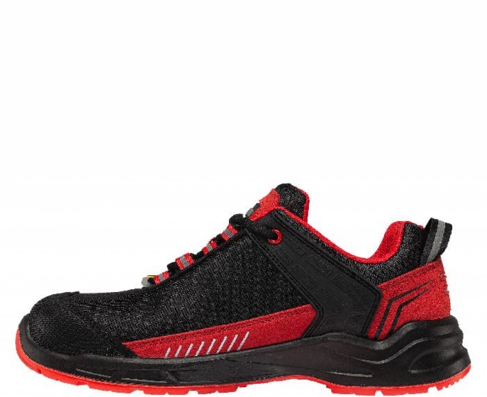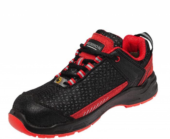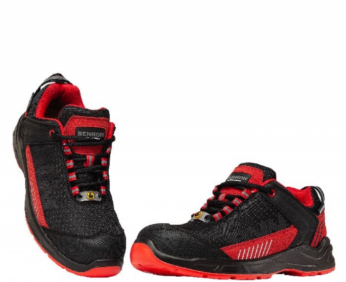 Półbuty BENNON LUMINO S1P ESD NML Low spełniają normy EN 20345 (środki ochrony indywidualnej – obuwie bezpieczne). Nowoczesny model półbutów z innowacyjną podeszwą z wygodną przestrzenią wewnętrzną CRONUS. Idealne dla osób dbających o komfort stóp podczas wielogodzinnej pracy. Sportowym designie w oryginalnej kolorystyce czarno- czerwonej. Cholewka wykonana jest przy użyciu technologii VOLT-REX + mikrofibra, zapewnia doskonałą widoczność z odległości a jej dodatkowym atutem jest mniejsza ilość szwów co zwiększa komfort noszenia. Wewnątrz podszewka z materiału tekstylnego MESH zapewnia stopie komfort podczas noszenia, wyściółka to anatomicznie ukształtowana wkładka ACTIVA ESD, która wspiera łuk podłużny i poprzeczny. Absorbcja energii w części piętowej amortyzuje wstrząsy, wpływa pozytywnie na długotrwałe lub nadmierne obciążenie stopy w pozycji statycznej i dynamicznym ruchu. Dla lepszej ochrony palców obuwie zostało wyposażone w podnosek kompozytowy i wkładkę kevlarową odporną na przebicia. Model spełnia wymogi normy ESD, zapobiega naładowaniom elektrostatycznym poprzez odpowiednie odprowadzenie ładunków, będziesz bezpieczny a praca zostanie wykonana bez przeszkód, obuwie może być wykorzystywane w przestrzeniach EPA. Stabilna podeszwa wykonana z PU/PU CRONUS ma właściwości antystatyczne, antypoślizgowe, odporne na oleje, benzyny rozpuszczalniki. Półbuty wyposażone w elementy odblaskowe REFLEX zwiększają widoczność w półmroku i zacienionych miejscach. Dopasowanie za pomocą sznurówek, stabilizują stopę i zapewniają bezpieczeństwo podczas chodzenia. Bardzo designerskie półbuty w atrakcyjnej kolorystyce nie zawierają metalu, mogą być stosowane w przemyśle ciężkim i lekkim. Polecane dla budowlańców, drogowców, brukarzy, magazynierów, mechaników i produkcji przy taśmie.