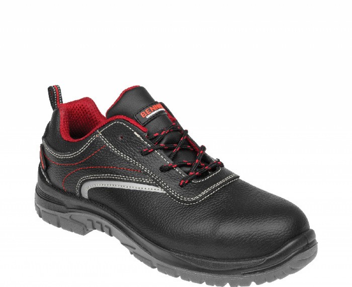 Niemetalowe półbuty bezpieczne, których cholewka wykonana jest z hydrofobowej skóry bydlęcej.