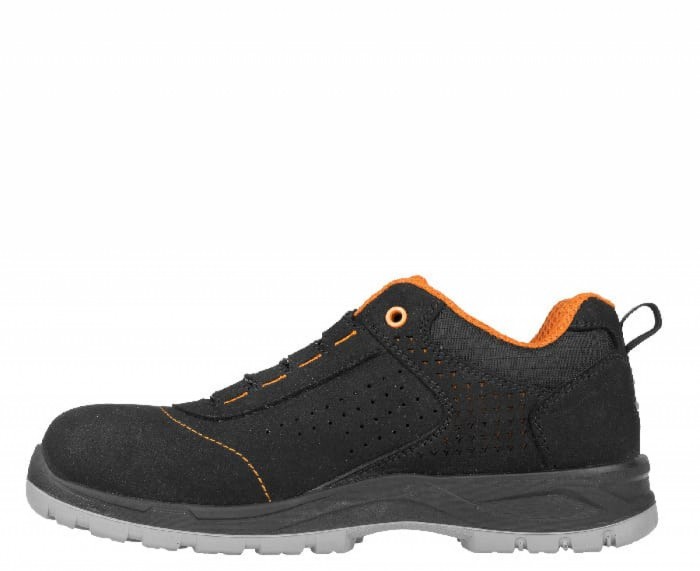Półbuty NUX S1P ESD NM Low/ BENNON spełniają normy EN 20345 (środki ochrony indywidualnej – obuwie bezpieczne). Lekkie półbuty o nowoczesnym designie w oryginalnej kolorystyce czarno- pomarańczowej z kontrastowymi szwami. Cholewka wykonana z milrofibry, perforowana po bokach sprawia, że obuwie jest bardziej przewiewne i oddychające. Wewnątrz podszewka z materiału tekstylnego MESH zapewnia stopie komfort podczas noszenia, wkładka D-SOLE anatomicznie ukształtowana wkładka wykonana z włókniny i tkaniny Cambrella na powierzchni, o doskonałej absorpcji i desorpcji wilgoci. Wkładka zawiera antystatyczne szwy. Absorbcja energii w części piętowej amortyzuje wstrząsy, wpływa pozytywnie na długotrwałe lub nadmierne obciążenie stopy w pozycji statycznej i dynamicznym ruchu. Dla lepszej ochrony palców obuwie zostało wyposażone w podnosek kompozytowy i wkładkę kevlarową odporną na przebicia. Model spełnia wymogi normy ESD, zapobiega naładowaniom elektrostatycznym poprzez odpowiednie odprowadzenie ładunków, będziesz bezpieczny a praca zostanie wykonana bez przeszkód, obuwie może być wykorzystywane w przestrzeniach EPA. Stabilna podeszwa wykonana z PU/PU HIGHWAY ma właściwości antystatyczne, antypoślizgowe, odporne na oleje, benzyny rozpuszczalniki. Półbuty wyposażone w elementy odblaskowe REFLEX zwiększają widoczność w półmroku i zacienionych miejscach. Dopasowanie za pomocą sznurówek, stabilizują stopę i zapewniają bezpieczeństwo podczas chodzenia. Bardzo designerskie półbuty robocze w atrakcyjnej kolorystyce nie zawierają metalu, mogą być stosowane w przemyśle ciężkim i lekkim. Polecane dla budowlańców, drogowców, brukarzy, magazynierów, mechaników i produkcji przy taśmie.