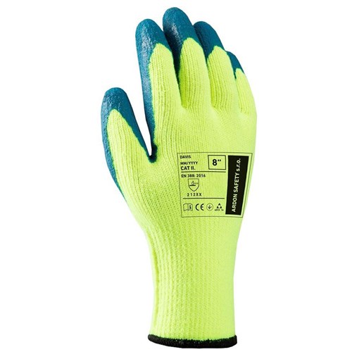 Rękawice ocieplane DAVIS, ARDON,spełniają normy EN420/ EN 388. CAT.II. Wykonane z żółtej dzianiny akrylowej maczanej w niebieskim lateksie, wykończone elastycznym mankietem zapobiegającym zsuwaniu. Rękawice są elastyczne, dopasowane, mają doskonałą chwytność, odporne na zanieczyszczenia, uszkodzenia. Sprawdzają się w niskich temperaturach, idealne do pracy na zewnątrz w porze jesienno-zimowej, dzięki kolorystyce, bardzo widoczne. Znajdują zastosowanie w transporcie i logistyce, na budowie, przy obsłudze maszyn w zimnym środowisku, chłodniach, magazynowaniu, pakowaniu i wszelkich pracach drogowych. Doskonały produkt firmy ARDON.
