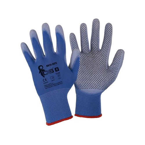 Rękawice robocze CXS BRITA DOTS, CANIS, spełniają normy, EN 420/ EN 388. CAT.II. Wykonane z bezszwowej dzianiny w kolorze niebieskim, nakrapiane cienką warstwą poliuretanu w dłoni i na palcach. Elastyczny mankiet zwiększa dopasowanie do dłoni i zapobiega zsuwaniu. Nakropienie zapewnia przyczepność przedmiotu trzymanego. Odporne na zabrudzenia i zanieczyszczenia, chronią dłonie przed niewielkimi urazami i uszkodzeniami typu: przetarcia, przecięcia, rozdarcia. Idealnie nadają się do prac wymagających dobrej chwytności. Lekkie i wygodne, dedykowane pracom lekkim w środowisku suchym o średnim poziomie zagrożenia, na budowie, magazynach, transporcie, spedycji i ogrodzie a także podczas sprzątania.